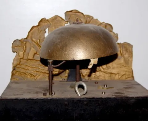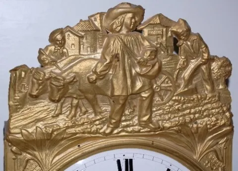 pressed brass front w/ farmers, oxen and cart near village; porcelain dial w/ calendar dates; brass pendulum says Fritz a Montbrison; bell striking; nice condition. (Minor roughness; pendulum has a few dents and scratches.)