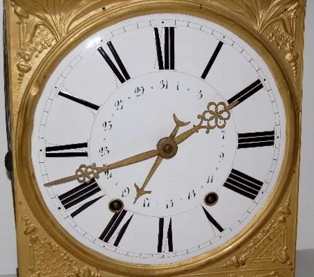 Antique Calendar Dial Mobier Wall Clock pressed brass front w/ farmers, oxen and cart near village; porcelain dial w/ calendar dates; brass pendulum says Fritz a Montbrison; bell striking; nice condition. (Minor roughness; pendulum has a few dents and scratches.)