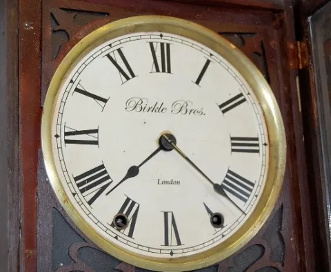 Jerome Antique Wall Clock, Birkle Bros. London brass trim and pendulum; mirror back; scroll, carvings and finials; time and strike. 36"