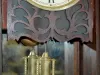 brass trim and pendulum; mirror back; scroll, carvings and finials; time and strike. 36"