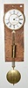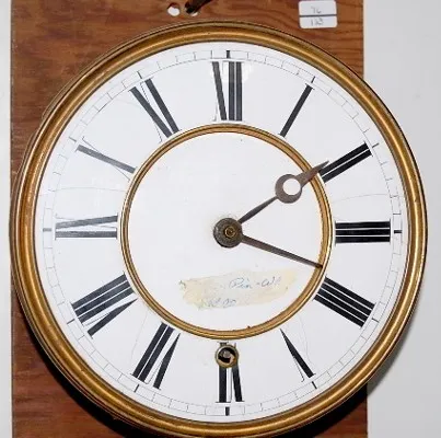 8" porcelain dial; brass trim, weight and pendulum; no clock case, screwed to plywood; old brass plate movement. (Dial is hairlined.)
