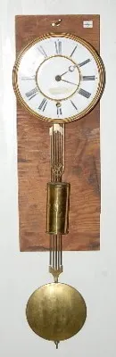 Pinwheel Regulator 1 Weight Clock 8" porcelain dial; brass trim, weight and pendulum; no clock case, screwed to plywood; old brass plate movement. (Dial is hairlined.)