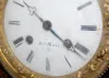 porcelain dial marked "Ree Marc a' Paris"; Roman numerals; time and strike; winged cherub on top with man's face above dial; leafy sides and feet; movement marked 1945 Rt. Marc, Paris; has pendulum; time and strike; cutout brass overlay with painted and applied pieces depicting 2 flute players. (No back; front split; some brass and shell inlay missing; top is cracked on both sides.) 22" x 13" x 5"