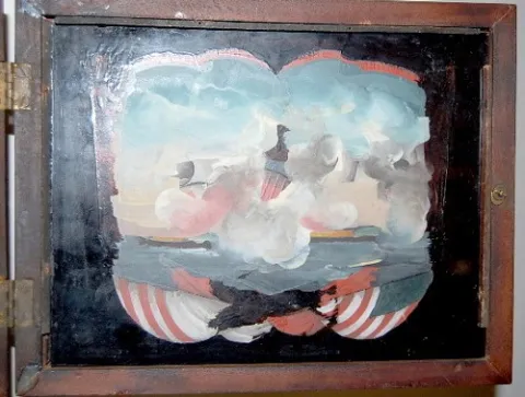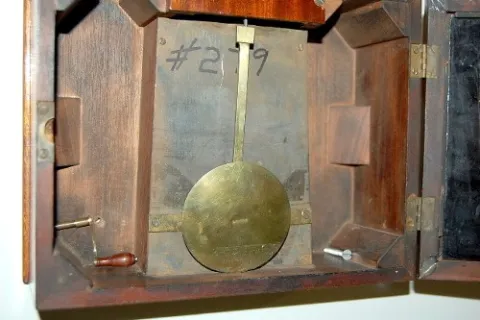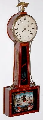 with "Capture of Syane and Levant" tablet; inlaid mahogany case; movement inscribed repaired in 1846 and other; has pendulum and key....
