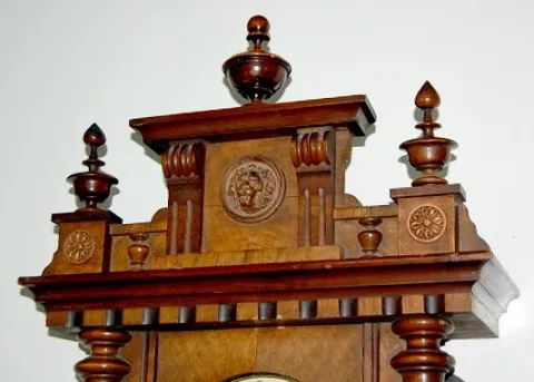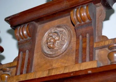 with seconds bit; nice carvings, lion head and finials; porcelain dial and chapter ring; brass trim and pendulum. (Case has a couple wood splits; minor veneer losses; the pendulum and weights have a few dents.) 50"