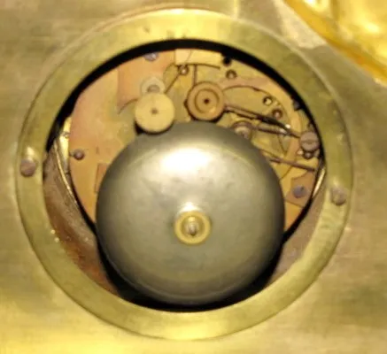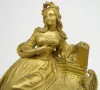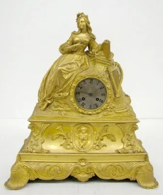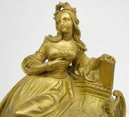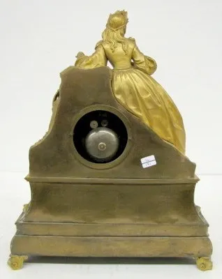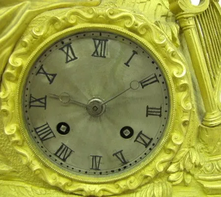 Antique French Empire Dore Lady Figural Clock lady in period dress with book and harp; winged cherub with horn and torch; metal dial with Roman numerals; time and strike; has pendulum; movement marked C P 158 712. (Wound tight.) 17 3/4" x 15 1/2" x 6 1/4"
