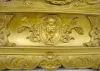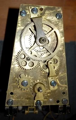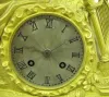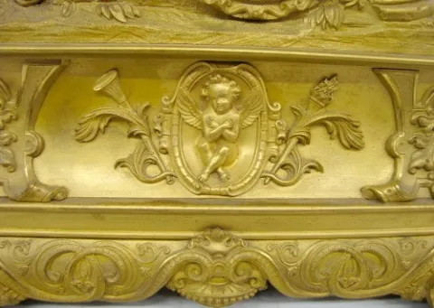 lady in period dress with book and harp; winged cherub with horn and torch; metal dial with Roman numerals; time and strike; has pendulum; movement marked C P 158 712. (Wound tight.) 17 3/4" x 15 1/2" x 6 1/4"