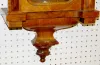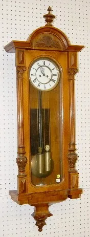 Walnut 2 Wt. Vienna Regulator Clock 6 1/2" porcelain dial and chapter ring; brass trim, pendulum and weights; nice carvings. (Weights are dented; misc. worm holes in case.) 48"