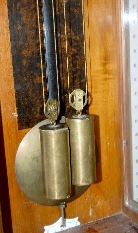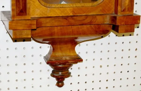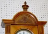 6 1/2" porcelain dial and chapter ring; brass trim, pendulum and weights; nice carvings. (Weights are dented; misc. worm holes in case.) 48"