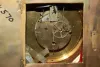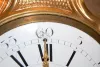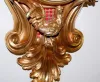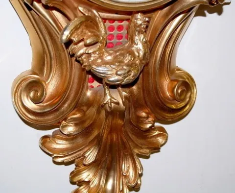 Large leaf and floral frame; cherub and globe; large full bodied rooster. (porcelain dial has some damages and touch up; missing small brass decoration on right side.) 27"