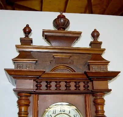 3 Weight Vienna Regulator Clock with key and pendulum. (Few minor rough spotss to case; one small trim ball on the bottom is missing. 60"