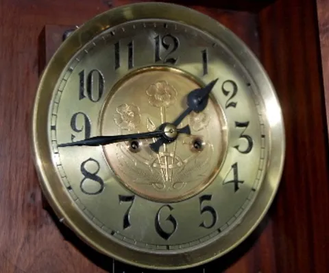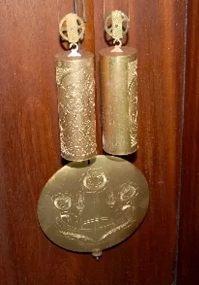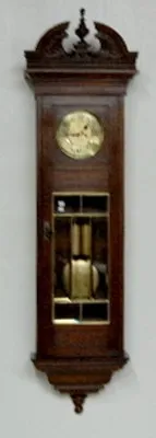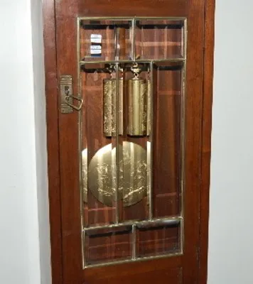 2 Weight Engraved 1882 Large German Clock brass dial, trim, weights and pendulum; beveled glass; engraved panel Lehrner Kaschan Uhmacher und Juwelier Oktober 11, 1882. 58 1/2" T (without top) x 17"W.