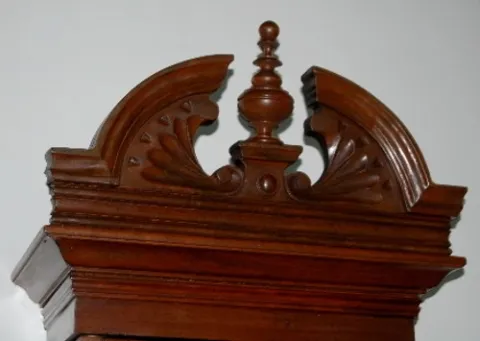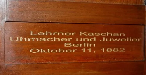 brass dial, trim, weights and pendulum; beveled glass; engraved panel Lehrner Kaschan Uhmacher und Juwelier Oktober 11, 1882. 58 1/2" T (without top) x 17"W.