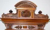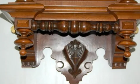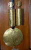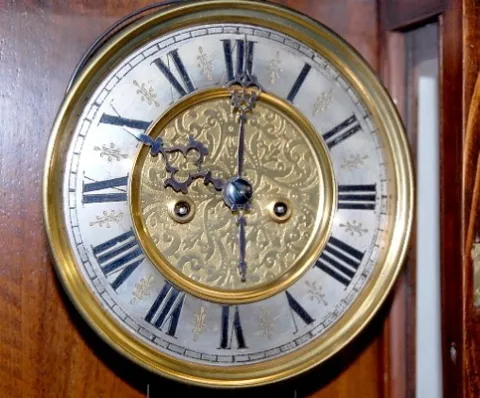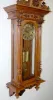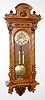 walnut carved case; engraved weights, dial and pendulum. 38"