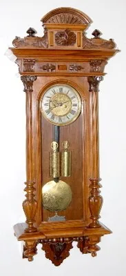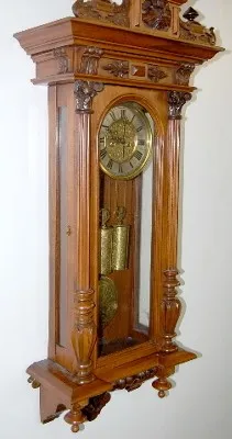 Antique 2 Weight German Engraved Clock walnut carved case; engraved weights, dial and pendulum. 38"