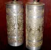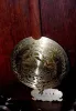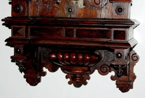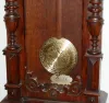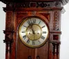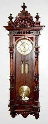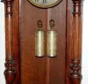 Oak Fancy 2 Weight Vienna Wall Clock oak case; engraved metal dial; Roman numerals; engraved swan pendulum; engraved weights; has key; time and strike. 48" x 16" x 8"