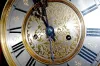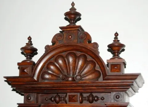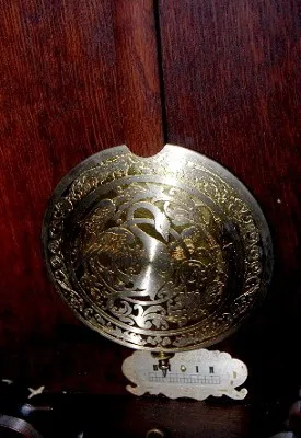 oak case; engraved metal dial; Roman numerals; engraved swan pendulum; engraved weights; has key; time and strike. 48" x 16" x 8"