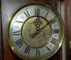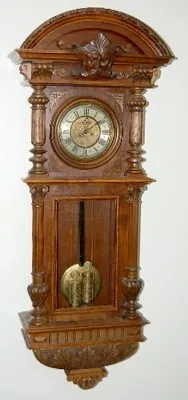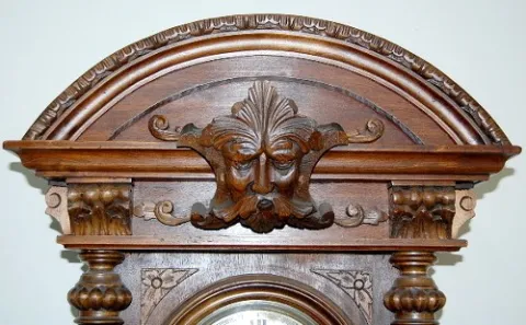 Antique Carved and Engraved 2 Weight Vienna Clock heavy carved walnut case w/large man's face 48"