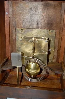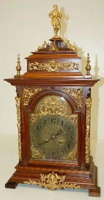 Ornate Lenzkirch Figural Crusader Shelf Clock walnut case; ornate bronze winged angels; lady head; fancy engraved dial; dolphin heads on top by crusader type figural finial. 26 1/2"
