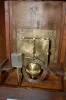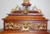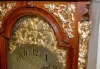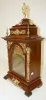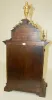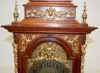 walnut case; ornate bronze winged angels; lady head; fancy engraved dial; dolphin heads on top by crusader type figural finial. 26 1/2"