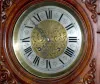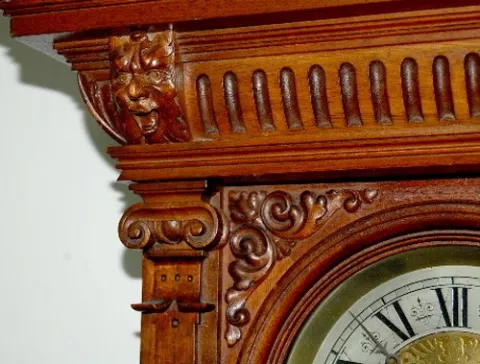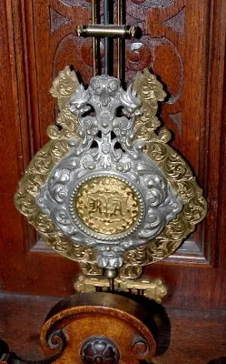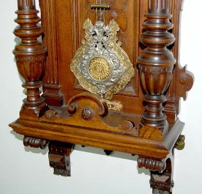 Lenzkirch type; engraved dial; heavy ornate pendulum; walnut carved case w/masks.45"...