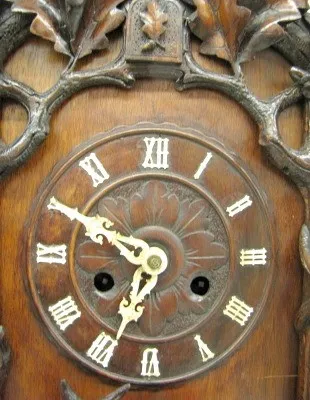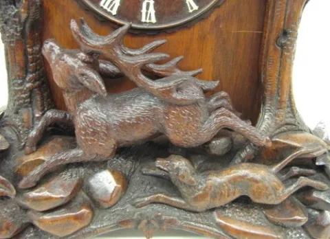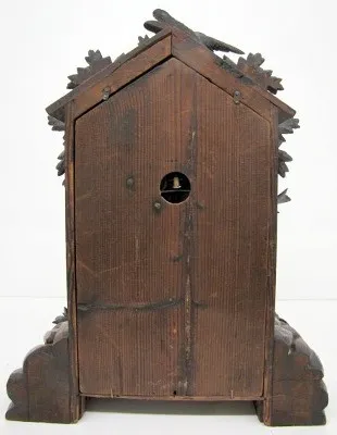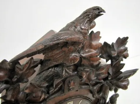 Black Forest Fusee Shelf Cuckoo Clock W/ Birds ornate carved eagle and bird, stag and dog, squirrel. (Repainted; repaired wing to top eagle.) 24" x 17"