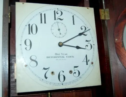 mahogany case w/ seconds bit; 11" dial; dated 1910. 42"...