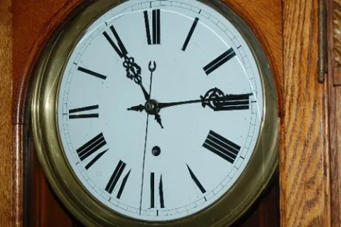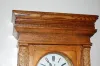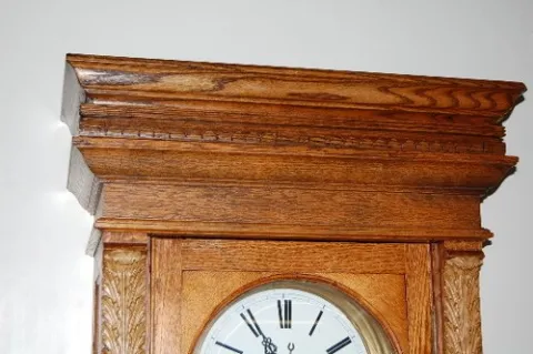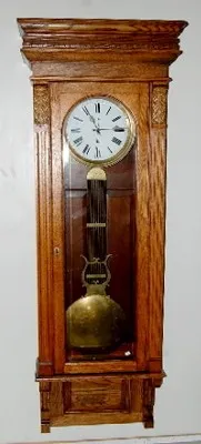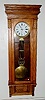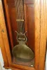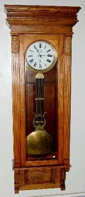 Oak Pinwheel Jeweler's Regulator Clock brass trim, weight and lyre pendulum; (Porcelain dial has minor scuffs.) 80" x 29"