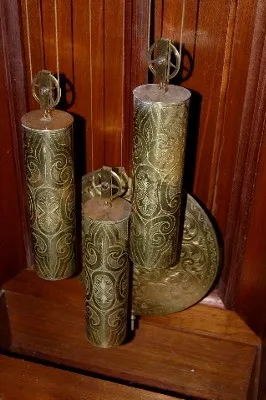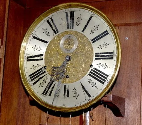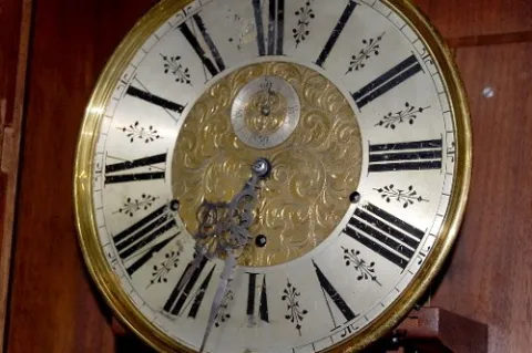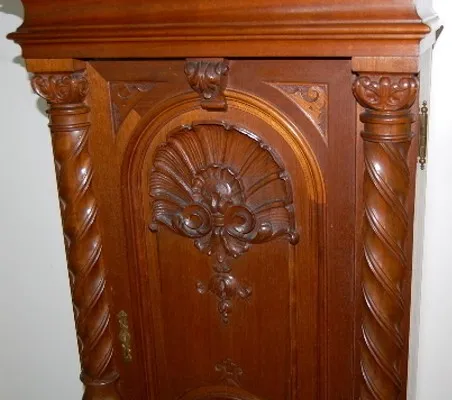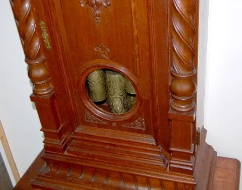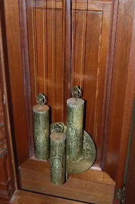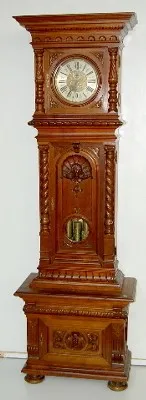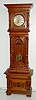 metal engraved dial w/ seconds bit; 3 engraved weights; bell striking chime; carved case. (Some scratches to lower part of the case; numerals and chapter ring have some wear.) 87 1/2" x 28 1/2" x 15 1/2"