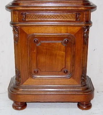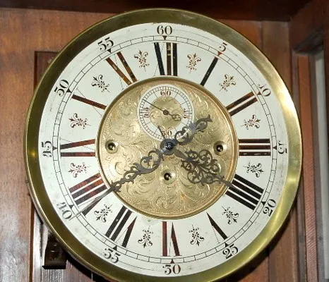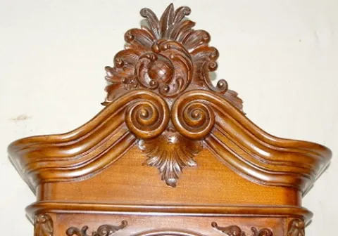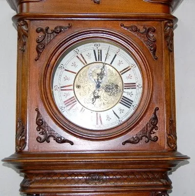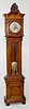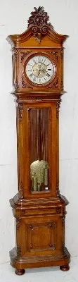 metal dial with seconds bit; carved case; engraved dial, pendulum and weights; clock comes apart in 2 pieces. 92 1/4" x 22" x 10 1/2"