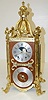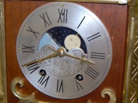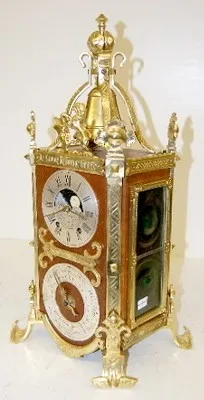 French Bronze Double Dial Calendar Clock Green Glass: with moon phase; bell top strike; figural lion and shield. 21"