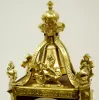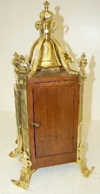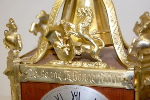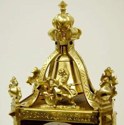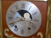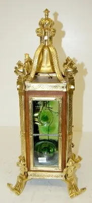 Green Glass: with moon phase; bell top strike; figural lion and shield. 21"
