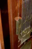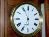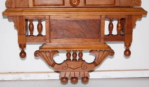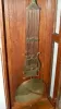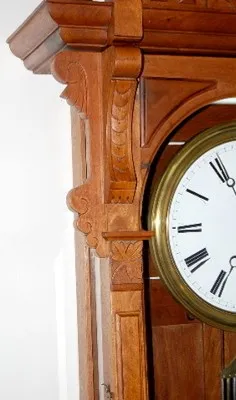 Ornate Pinwheel Jeweler's Regulator Clock brass trim, weight and Lyre pendulum; floral carved walnut case; porcelain dial; sweep second hand. (Minor roughness to case.) 90"