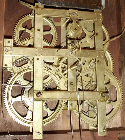 the imposing case has been nicely refinished, and retains its original paper label. There are a few small veneer repairs and losses. Glass and mirror putty in door looks old, and top glass is bubbly. Original painted dial has some wood showing, and has a little mirror panel that lifts up to reveal escape wheel. Large strap brass movement should be cleaned. The lower glass is a proper style repaint. Ht 37"
