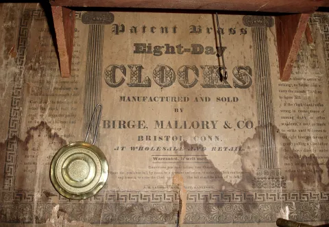 Birge, Mallory and Co, Bristol, Conn., 8 day weight driven time and strike mahogany column and cornice shelf clock, c1840 the imposing case has been nicely refinished, and retains its original paper label. There are a few small veneer repairs and losses. Glass and mirror putty in door looks old, and top glass is bubbly. Original painted dial has some wood showing, and has a little mirror panel that lifts up to reveal escape wheel. Large strap brass movement should be cleaned. The lower glass is a proper style repaint. Ht 37"