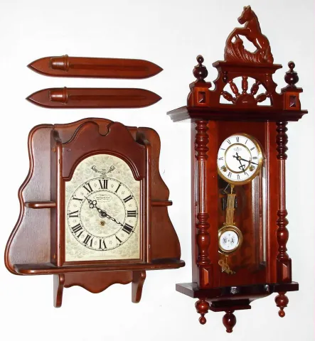 Clocks- 2 (Two) Wall Clock Reproductions 8 day: DEA R/A striker with large crest; New England time only with shelves and sconces