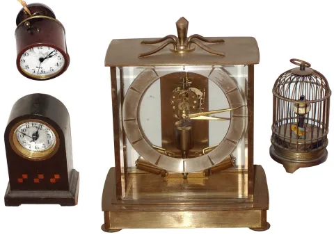 the brass and glass electronic is by Kieninger and Obergfell, and has a good glasses in a tarnished case, and worn dial, Ht 9 1/2". The inlaid wood roundtop has beveled glass, an alarm movement and the HAC crossed arrows trademark, Ht 5". Same trademark is on the little red metal drum case which needs its top bell reattached. Cutest is the tiny birdcage, tarnished brass, with its twitching bird and annular dial, Ht 6". All sold untested, as is.