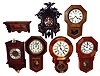 Clocks- 6 (Six) wall clocks: modern Asian wood reproductions including three schoolhouse, a mosaic ionic, and a two weight cuckoo. All except one are strikers. A wall mount shelf for gingerbreads completes the lot