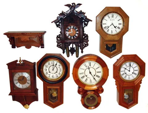 Clocks- 6 (Six) wall clocks: modern Asian wood reproductions including three schoolhouse, a mosaic ionic, and a two weight cuckoo. All except one are strikers. A wall mount shelf for gingerbreads completes the lot all the cases are in very nice condition. Largest is 23" high. Multiple lots sold "as is".