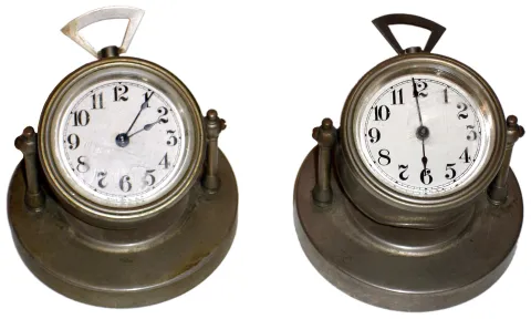 this pair of little novelty clocks have old original surfaces on their cases, and their white dials -- marked "Made in U.S.A." -- are near perfect. Be...