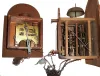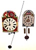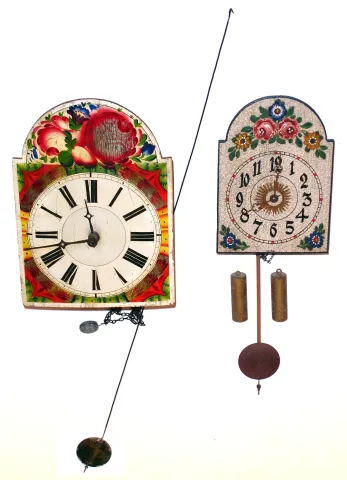 these are decorative rustic wall clocks, one antique and one a more modern reproduction. The dials are colorful, especially the larger older one which...