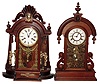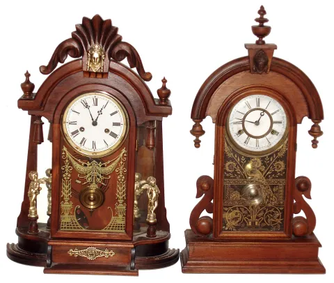 Clocks- 2 (Two) wood 8 day time and strike parlor clocks, 1 reproduction mirror-side and 1 old New Haven repro is quality modern version of New Haven "Occidental" in very good overall condition. The antique is that maker's "Parisian" model, c1890, walnut case refinished, paper dial torn and has all three finials replaced, Ansonia tablet and pendulum bob. Both movements could use cleaning. Hts 24".