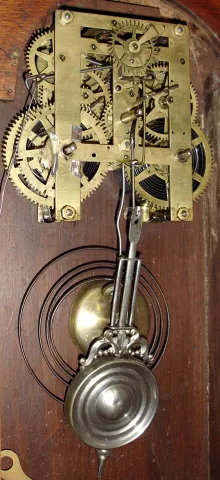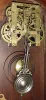 repro is quality modern version of New Haven "Occidental" in very good overall condition. The antique is that maker's "Parisian" model, c1890, walnut case refinished, paper dial torn and has all three finials replaced, Ansonia tablet and pendulum bob. Both movements could use cleaning. Hts 24".