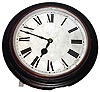 English round dial clock, 8 day, time only, spring driven fusee movement, winds and sets from rear of case, in cast iron case with 18" painted metal dial, c1875 the case has a 4 1/2" x 1" cast iron segment missing on the perimeter near 5:30. The case has an old repaint and a custom made stand painted white. This was designed for mounting in a wall with rear access, and with a small dial on the rear plate to show the position of the hour hand on the outside dial. Overall diameter 25"