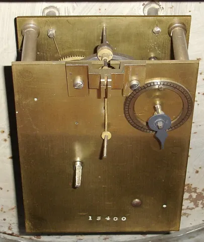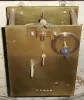 the case has a 4 1/2" x 1" cast iron segment missing on the perimeter near 5:30. The case has an old repaint and a custom made stand painted white. This was designed for mounting in a wall with rear access, and with a small dial on the rear plate to show the position of the hour hand on the outside dial. Overall diameter 25"