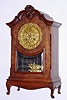 Japy Freres, French mantel clock, 8 day, time and gong strike, spring driven movement in mahogany case in the form of a wardrobe with case brass dial, c1870 the case retains its original finish and one of the front legs has been glue repaired. The hammer has broken off the arm for striking and has been placed in the bubble bag with the brass rose bouquet decorated pendulum. Ht 15"