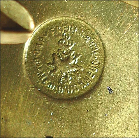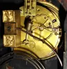 the case retains its original finish and one of the front legs has been glue repaired. The hammer has broken off the arm for striking and has been placed in the bubble bag with the brass rose bouquet decorated pendulum. Ht 15"