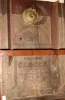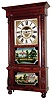 Refinished mahogany veneered case with a repair to a small piece of missing veneer with some colored wood filler and at the edges of the cornice top. Both tablets are of the proper design, but replacements. Slide mirror in the original dial is missing. Hands are original. Case houses a large strap brass movement. Ht 37 1/4".