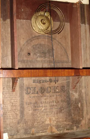 Birge, Mallory and Co., 8 day time and strike column and cornice or double decker shelf clock, c1846 Refinished mahogany veneered case with a repair to a small piece of missing veneer with some colored wood filler and at the edges of the cornice top. Both tablets are of the proper design, but replacements. Slide mirror in the original dial is missing. Hands are original. Case houses a large strap brass movement. Ht 37 1/4".