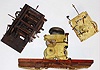 2 of these old movements look complete and usable. The 8 day brass works has rack and snail strike and grooved barrels. The wood movement is thick and chunky, on an old probably original seatboard. The most unusual is the cutaway 30 hour brass, complete with bell, pulleys and seatboard with a little "restored 1933" plate. Note: no pendulums, weights, dials, etc. Small movement doesn't appear complete as we see no minute post and hour gear different color and doesn't mesh with intermediate wheel.